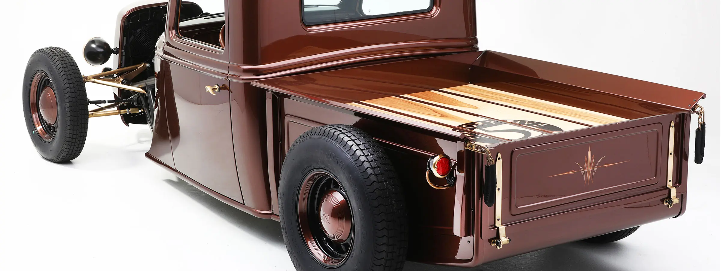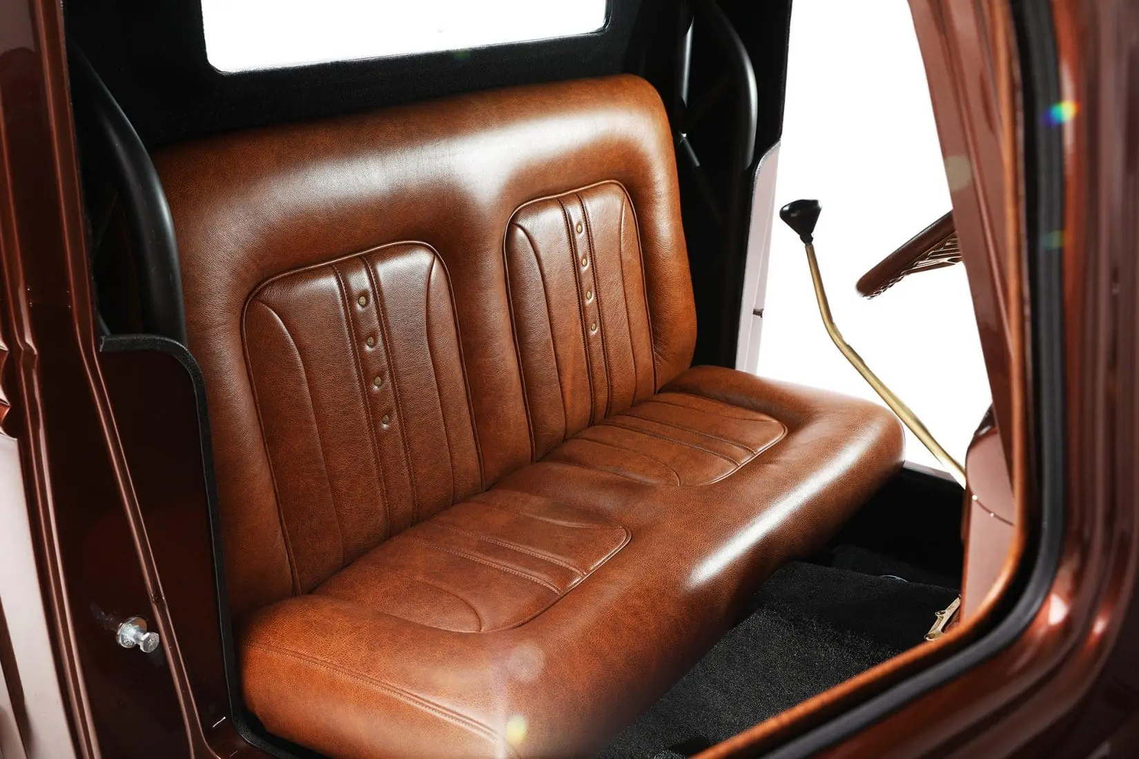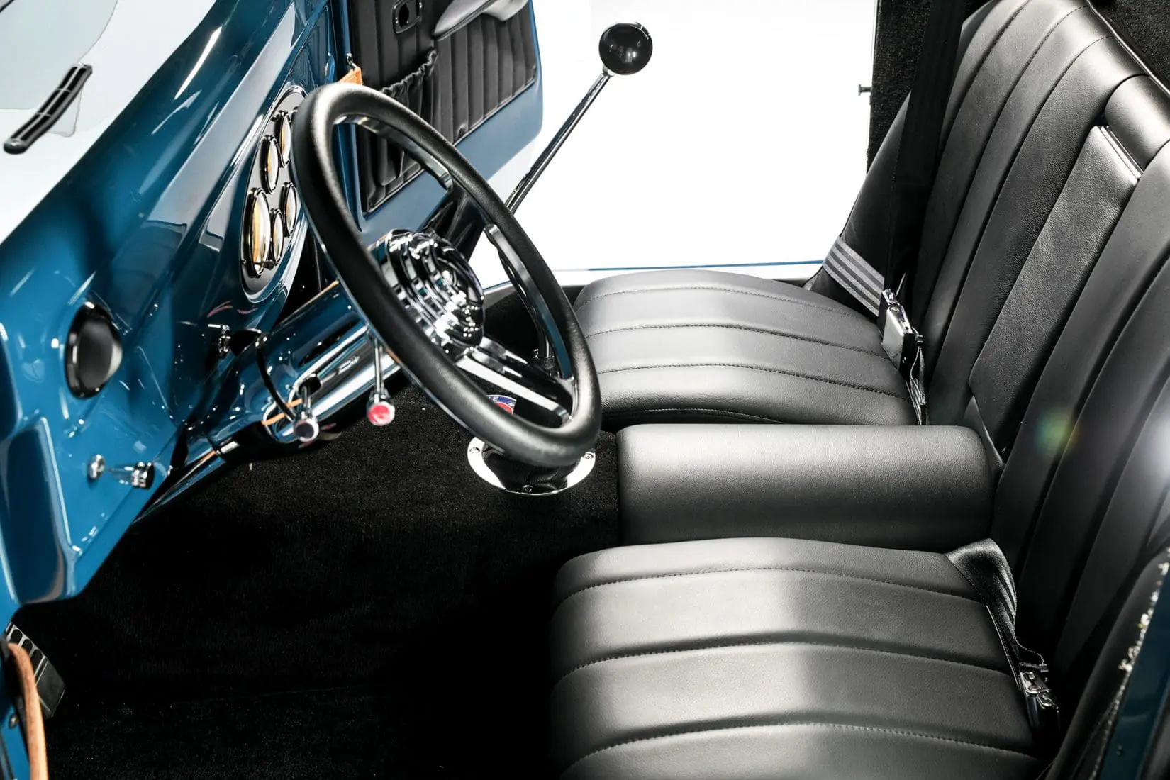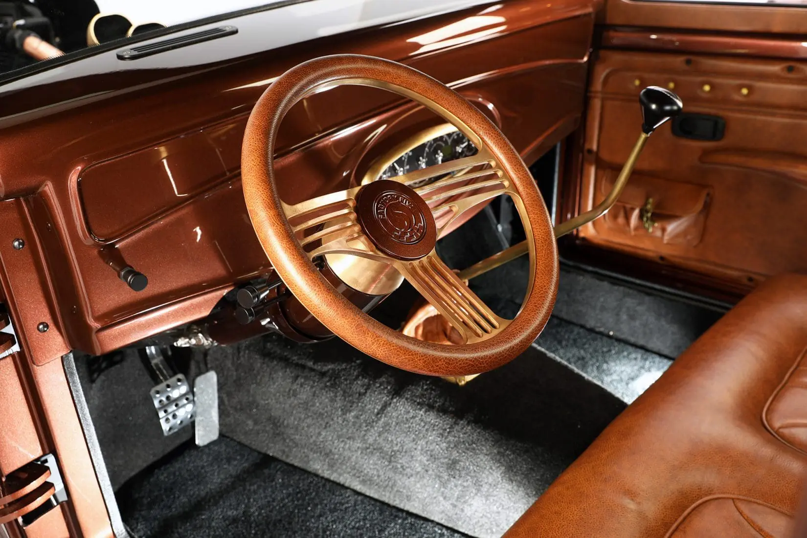 The ‘35 Hot Rod Truck keeps the core performance capability that we’re known for, but from the design goals on up, we added comfort and functionality goals. Our other cars are two passenger sports cars, and while this isn’t a four passenger, the bench seat means you and your girl can bring the dog or a kid. Standard power windows with door frame window surrounds mean air conditioning and heater/defroster make this truck modern-day comfortable.