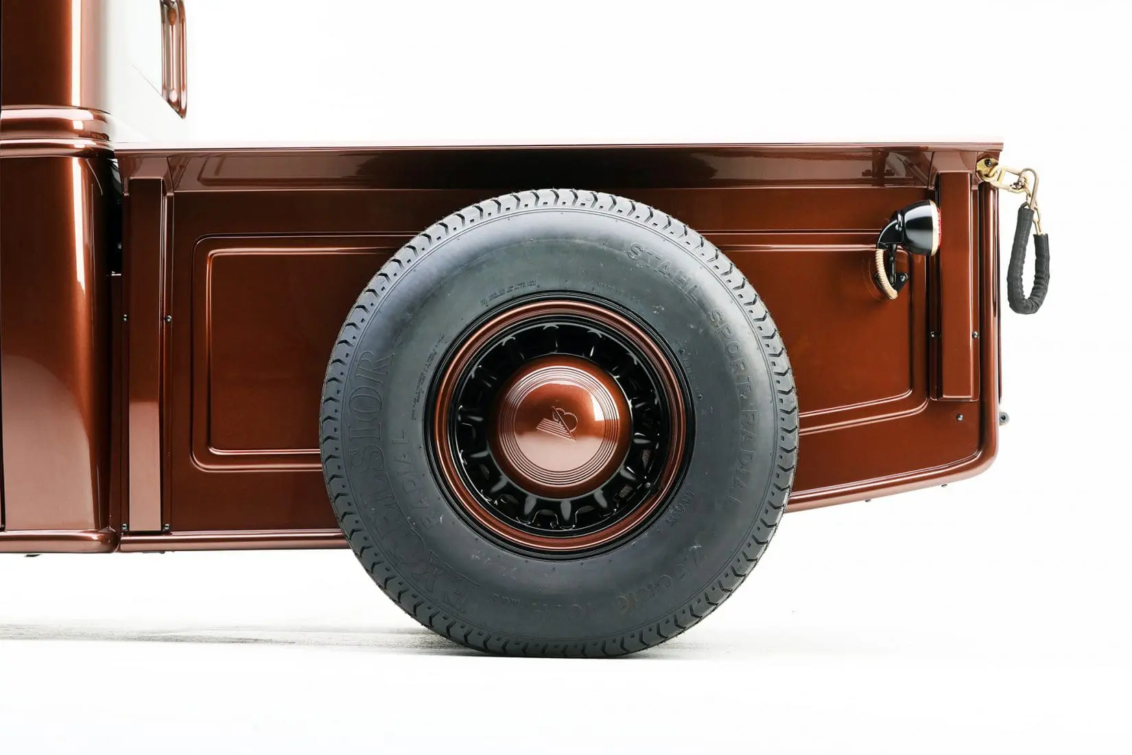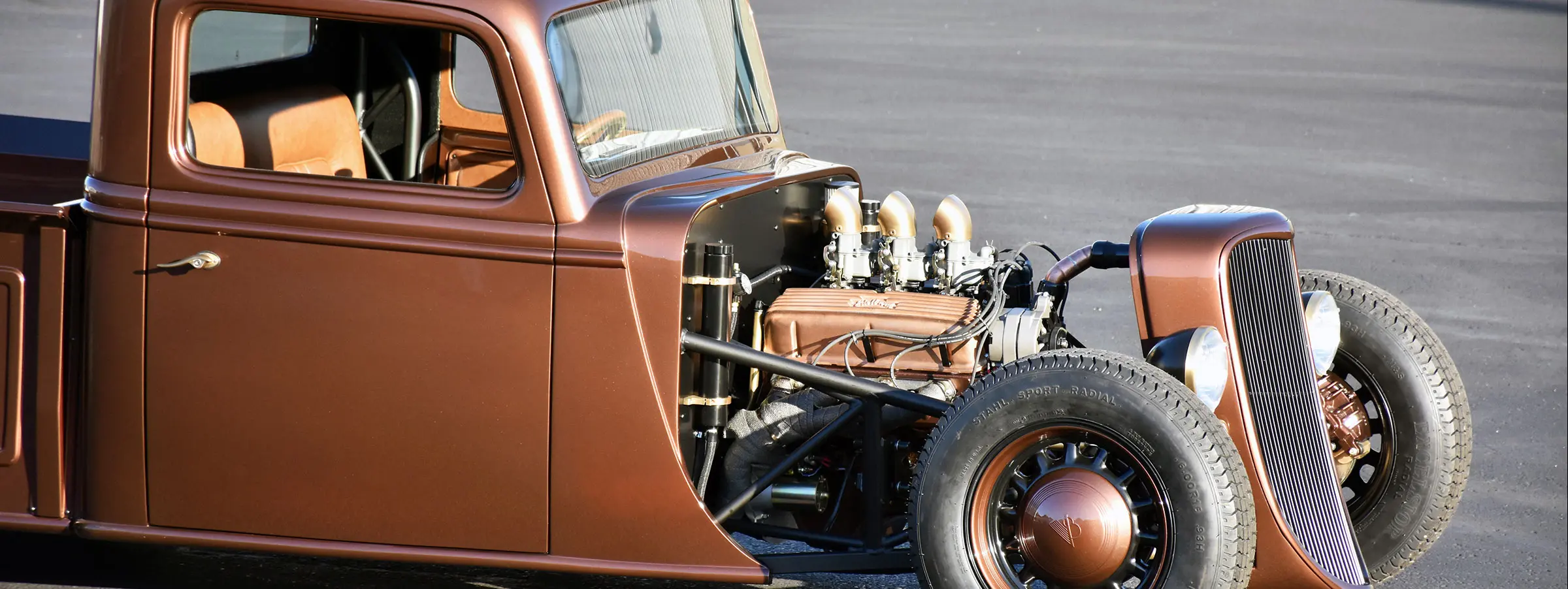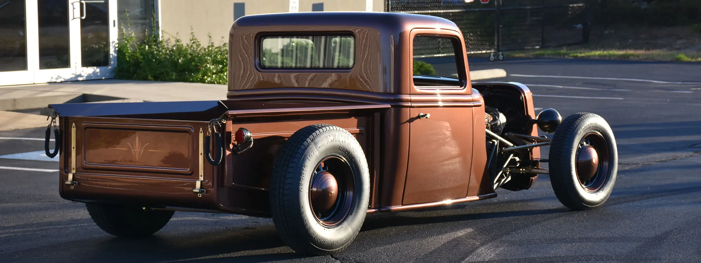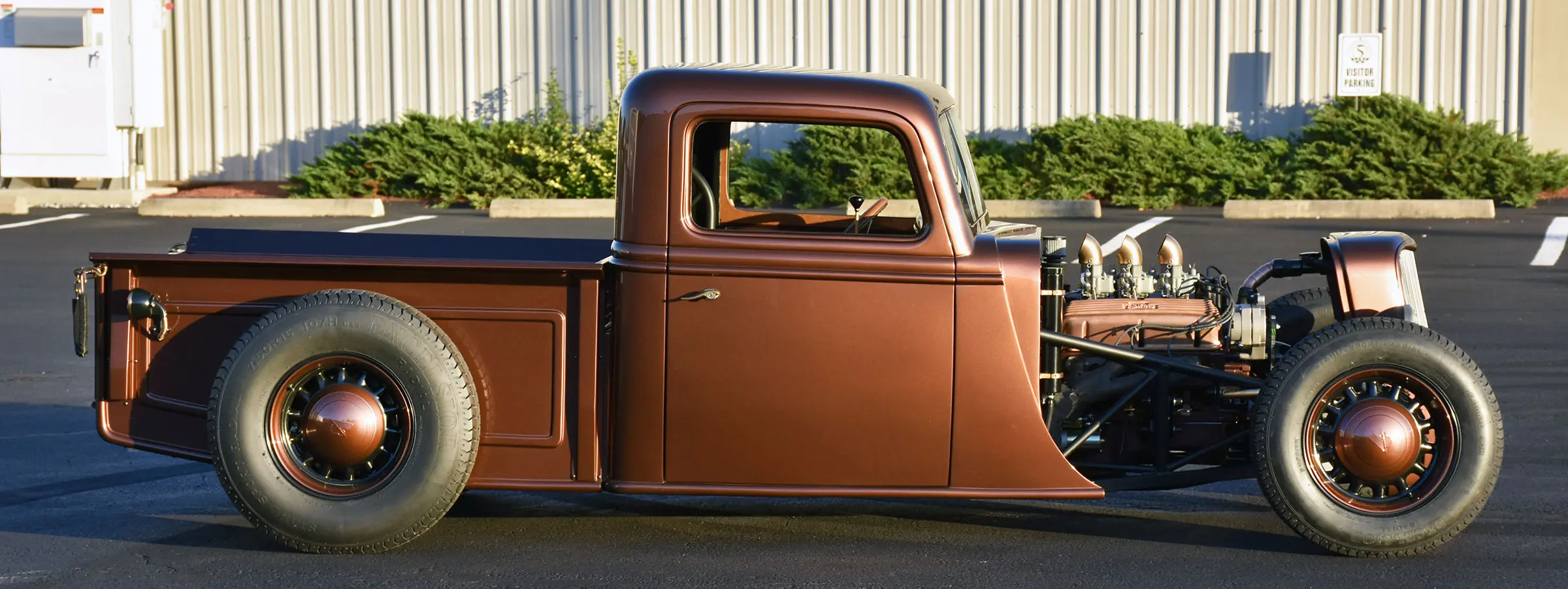 The ‘35 Hot Rod Truck keeps the core performance capability that we’re known for, but from the design goals on up, we added comfort and functionality goals. Our other cars are two passenger sports cars, and while this isn’t a four passenger, the bench seat means you and your girl can bring the dog or a kid. Standard power windows with door frame window surrounds mean air conditioning and heater/defroster make this truck modern-day comfortable.