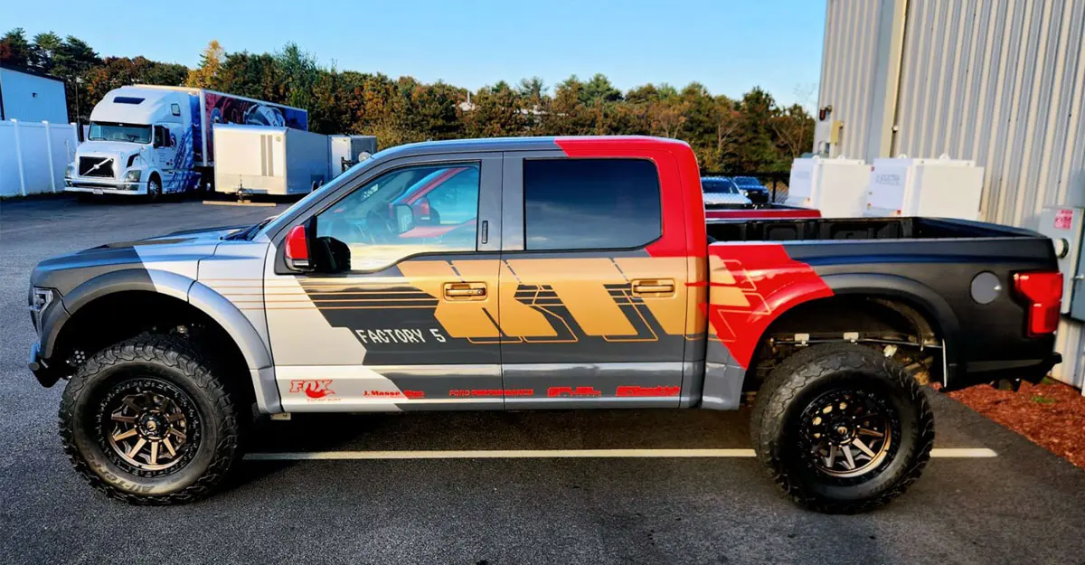 Check out these photos of the Factory Five Stage 1 XTF Truck that debuted at the 2024 SEMA Show. The truck was a built with a 2019 F-150 powered by a 5.0L Coyote V8. The cab and optional carbon fiber panels were wrapped by J. Masse Sign of Plainville, MA. Wheels are by Fuel Off-Road.
